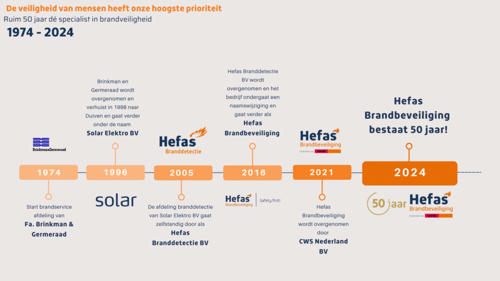 Vijf decennia van toewijding en expertise worden gevierd ter ere van het 50-jarig bestaan van Hefas Brandbeveiliging. Gedurende al die jaren hebben we ons ingezet om levens en eigendommen te beschermen tegen de dreiging van brand. Met een rijke geschiedenis van kennis en ervaring op het gebied van brandveiligheid en klantgerichtheid zijn we uitgegroeid tot een betrouwbare naam in de brandbeveiligingssector.